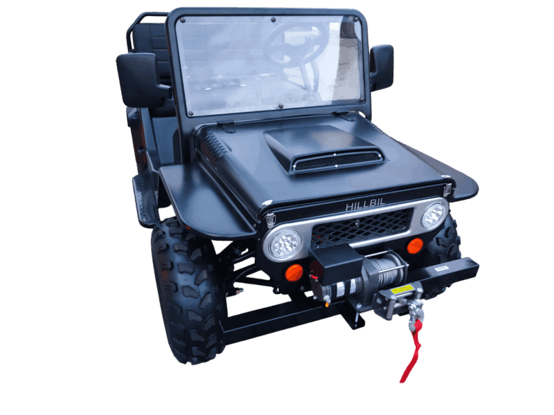 Optional mit Regendach, Anhängekupplung, Anhänger und Seilwinde erhältlich.